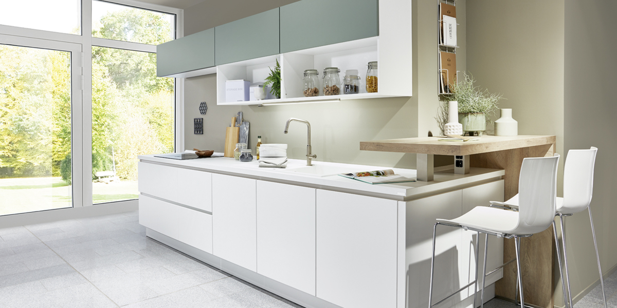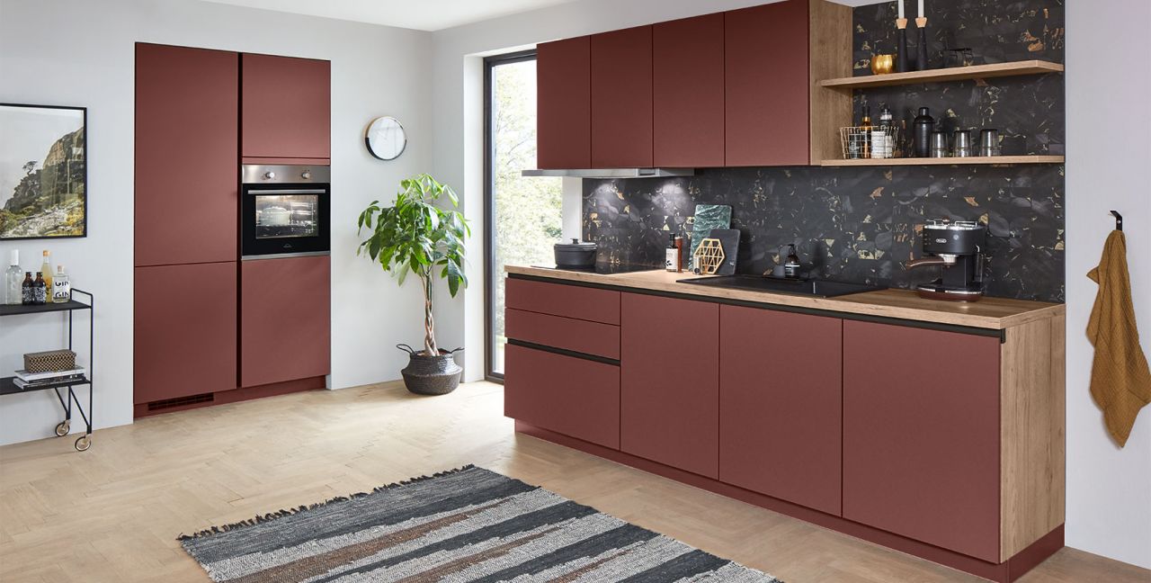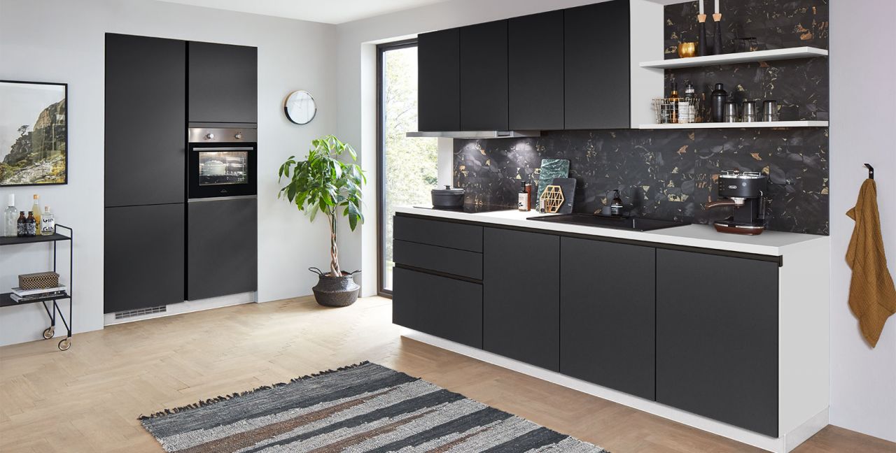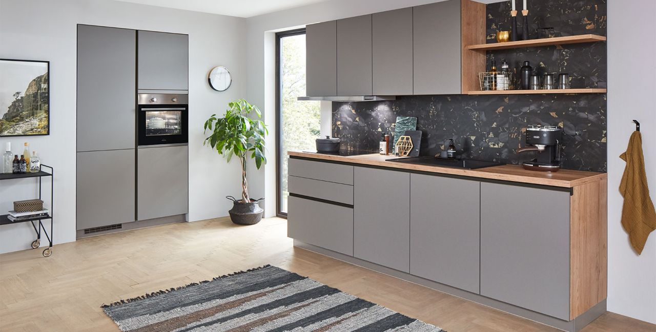 Inclusief RVS-inbouwoven Progress PBN13002X Energieklasse A, keramische kookplaat Progress PAS6001E, platte afzuigkap Progress PDP9040E Energieklasse A, koelkast Progress PK1214 Energieklasse F, inbouw-designspoelbak Elleci Logik 300, XL-kasten, onderkast met uittrekinterieur, wandborden.